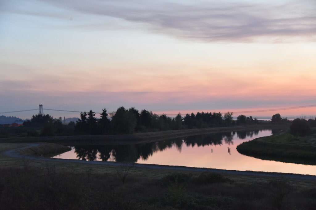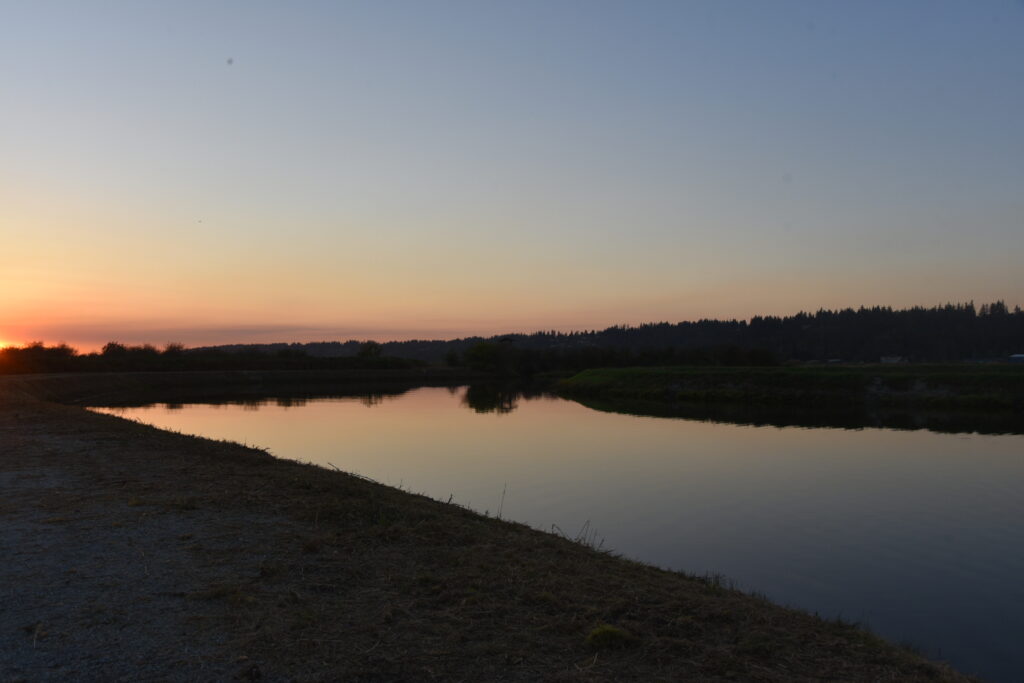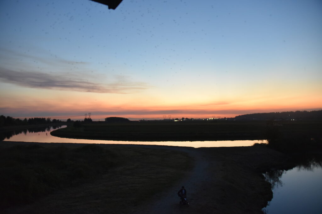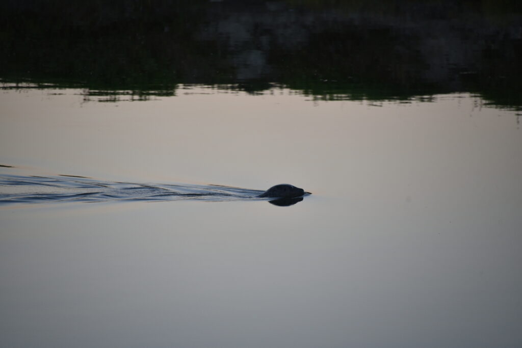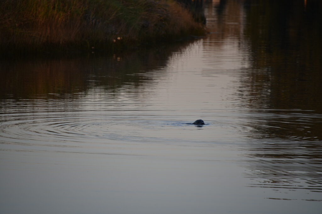 Serpentine Fen au coucher du soleil avec Hami, Jittu et Jind. Il y a un phoque qui sort la tête de l’eau de temps en temps.