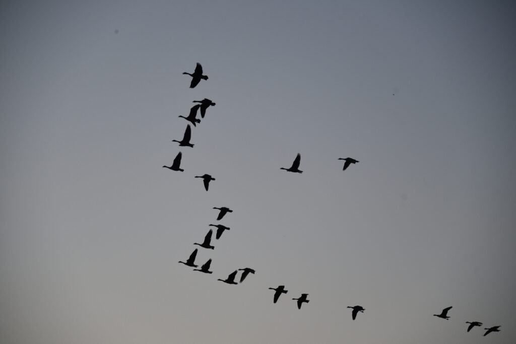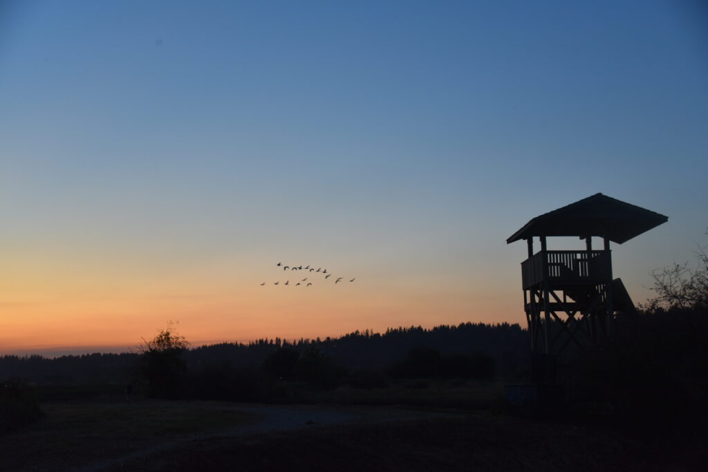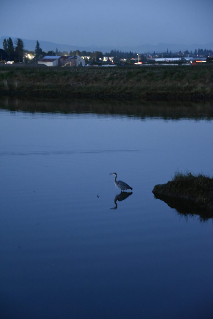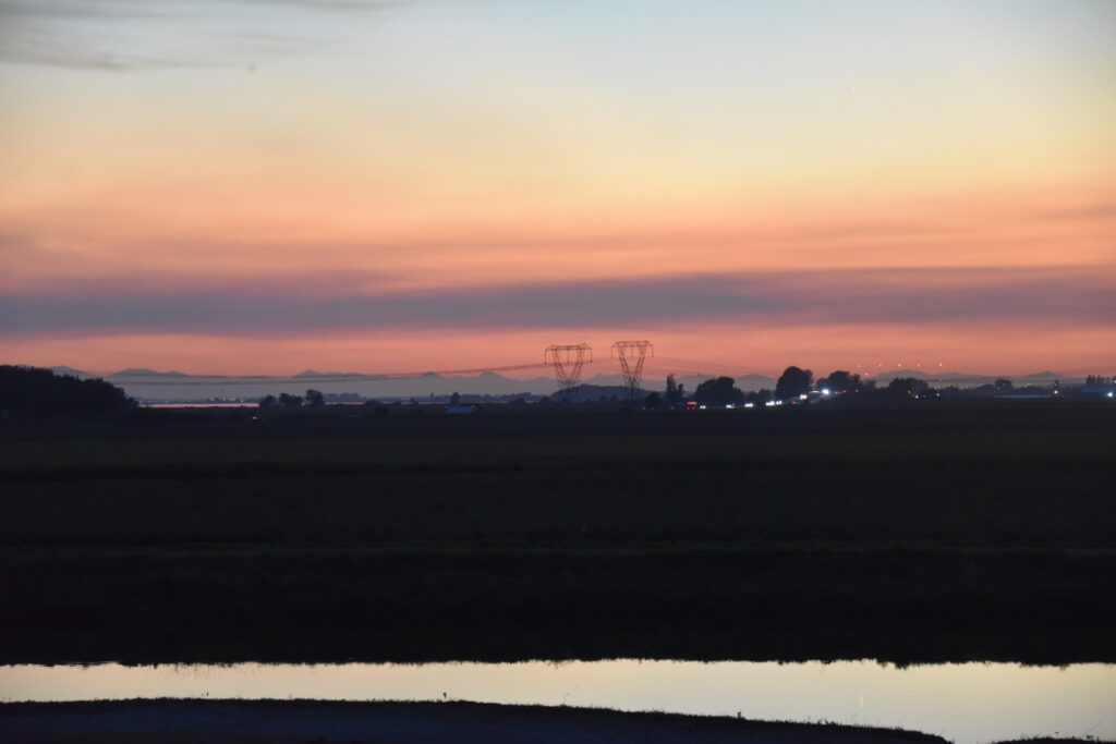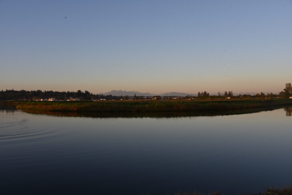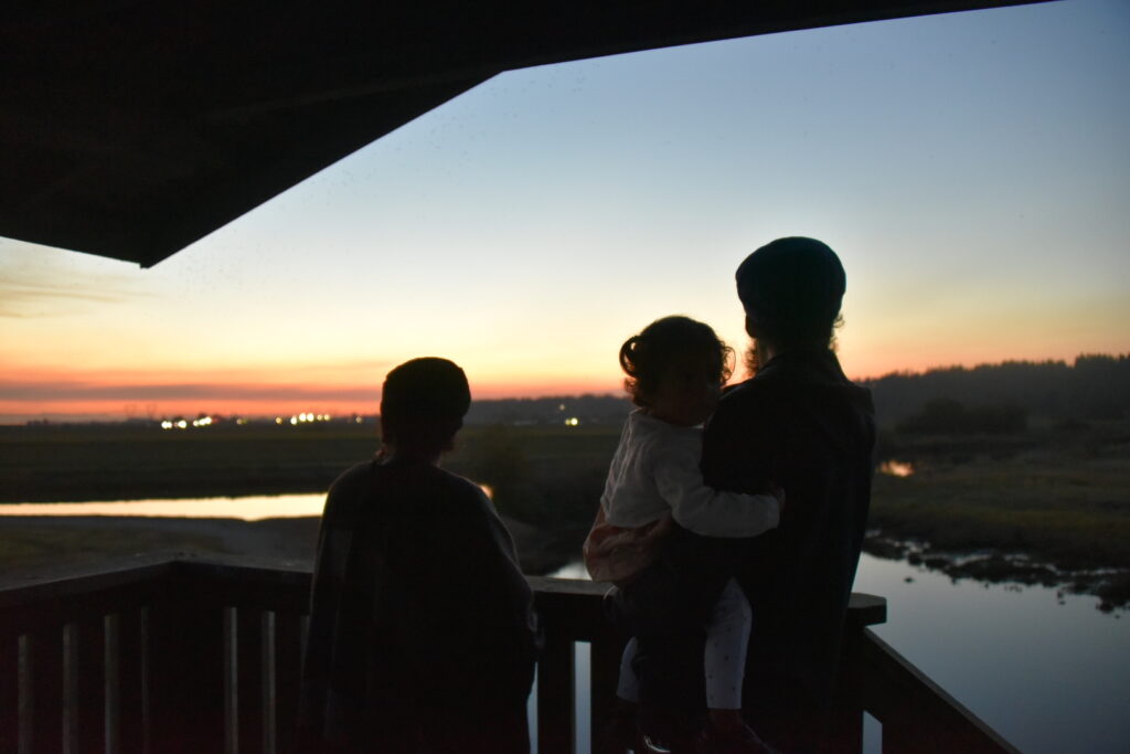 Serpentine Fen au coucher du soleil avec Hami, Jittu et Jind. Il y a un phoque qui sort la tête de l’eau de temps en temps.