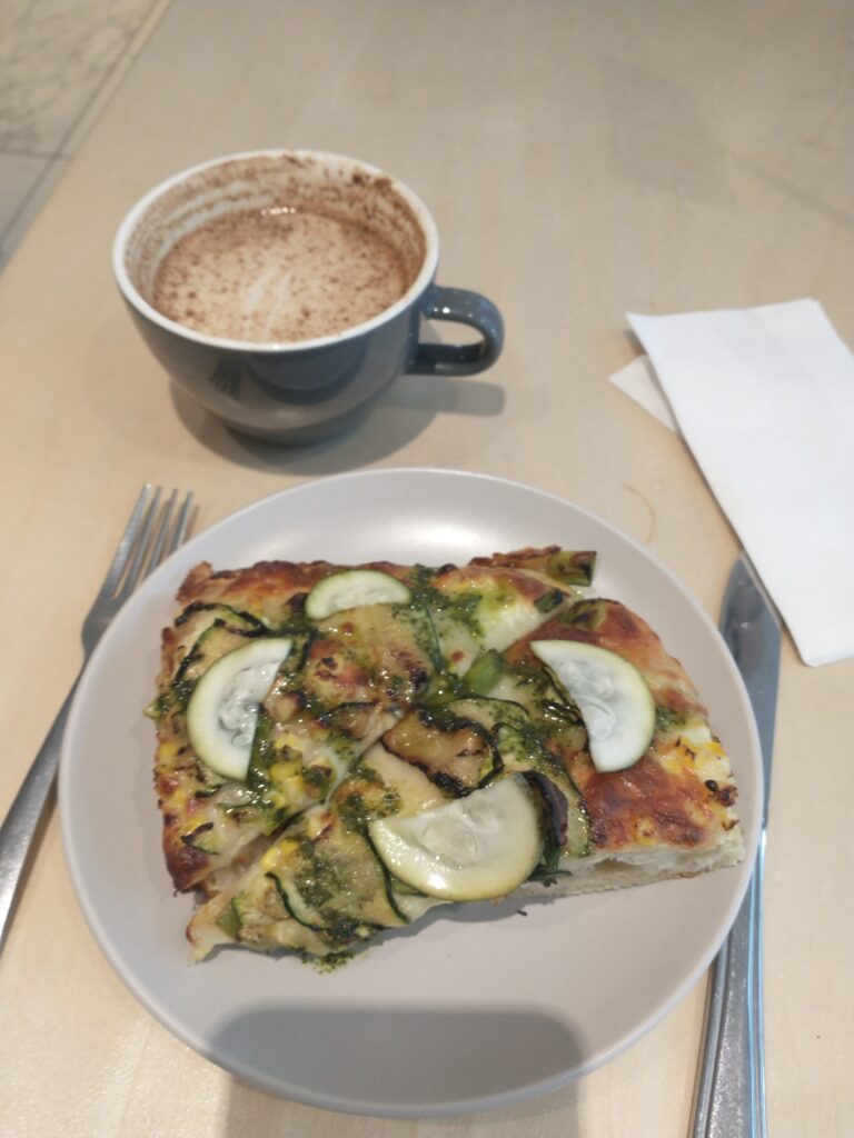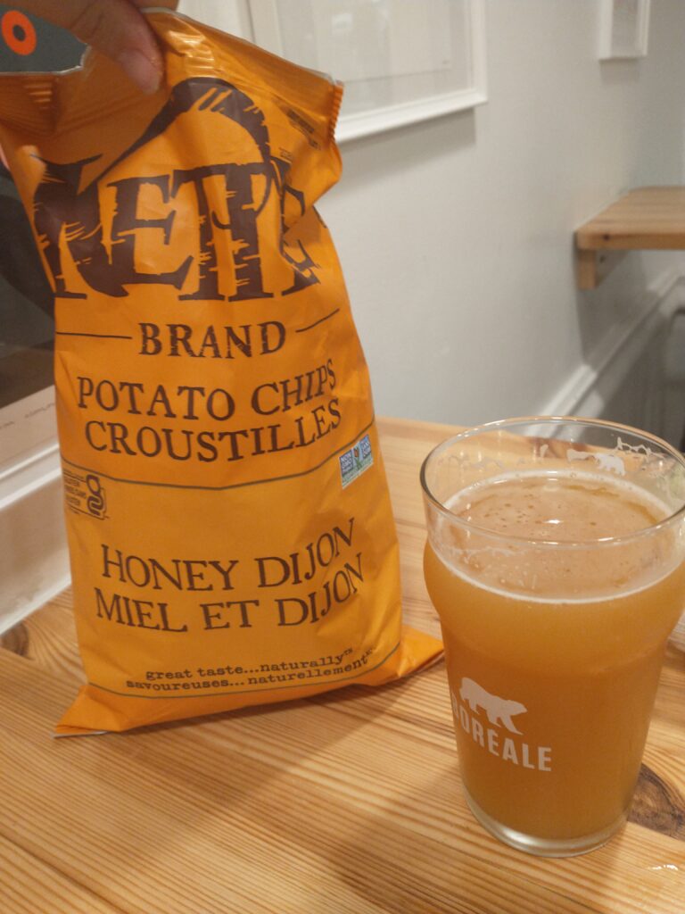Si vous voulez savoir j’ai mangé une pizza focaccia le midi, courgette pesto, la voilà avec un petit chaï latte au lait d’avoine. Et le soir, je mange à l’auberge, apéro : une IPA boréale (il y a un bar à l’auberge) avec des chips et riz uncle Ben’s tout prêt avec du brocoli passé au micro onde. C’est fade, mais j’ai une pomme et du chocolat en dessert.