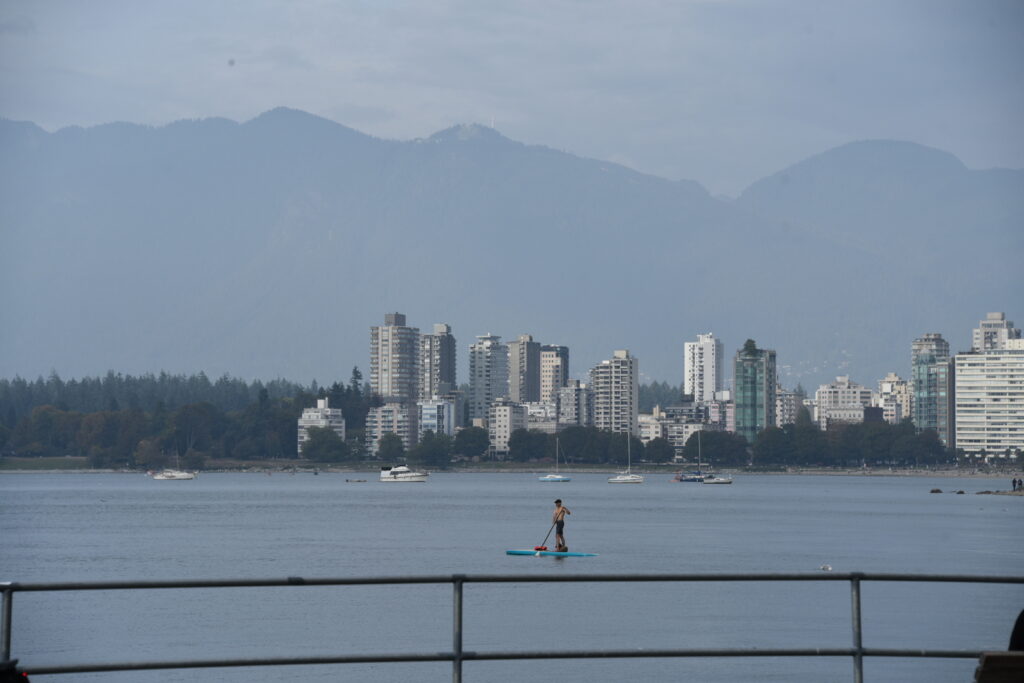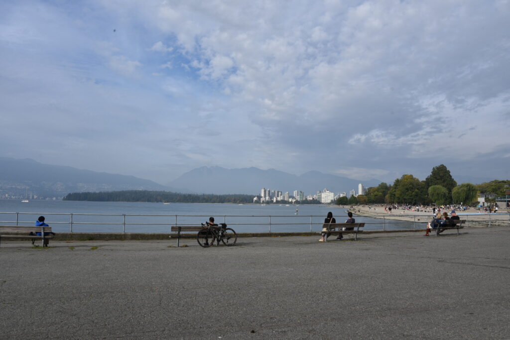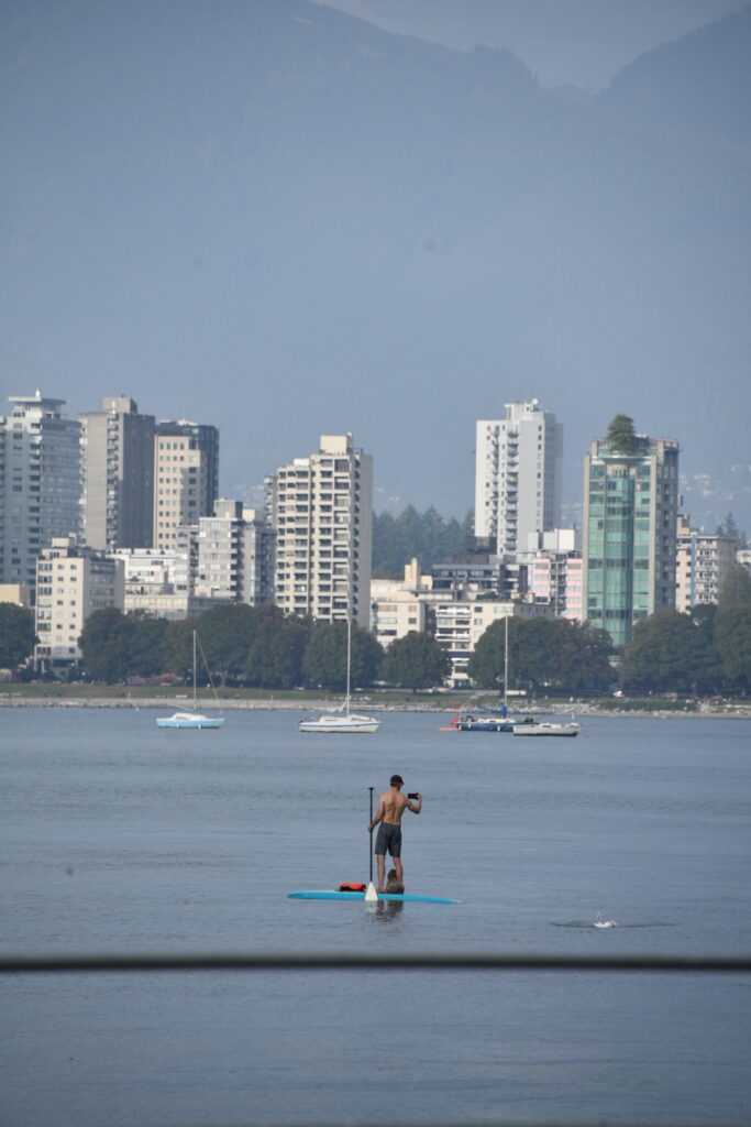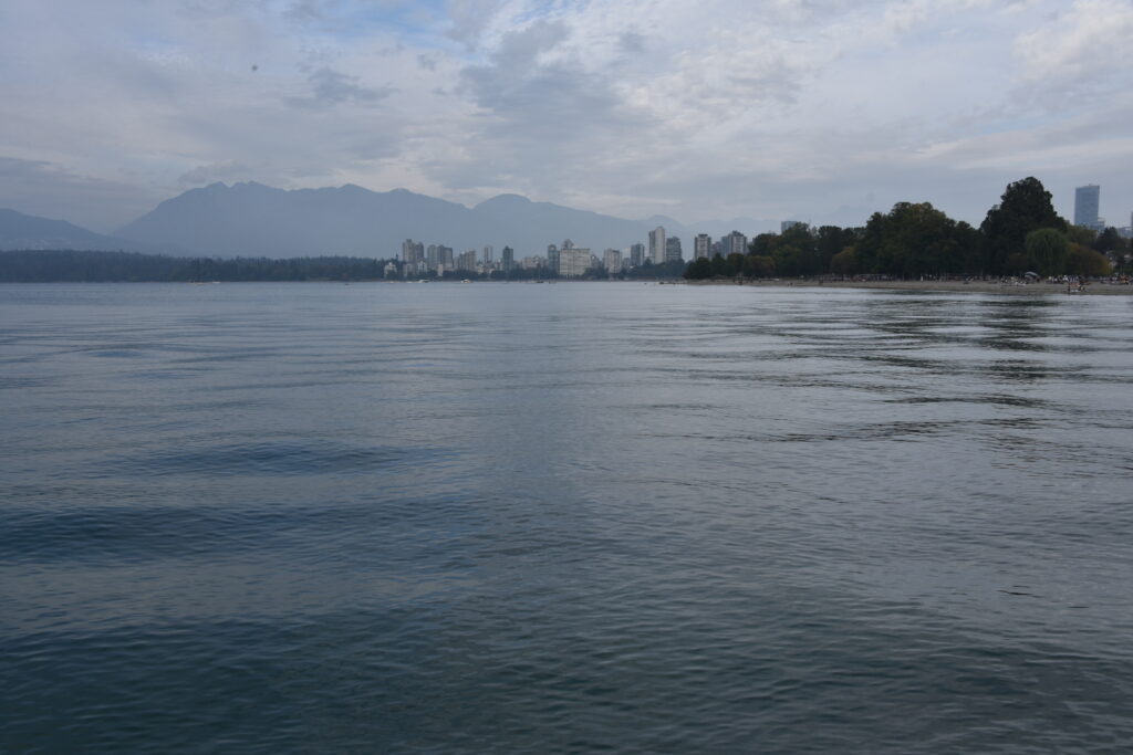Et enfin je me retrouve à Kitsilano Beach, à observer les gens et autres animaux. Un type fait du stand up paddle avec son toutou. Un groupe de papis avec un gros toutou noir ont mis leur musique a fond près des jeux pour enfants, le tourniquet tournicotte en rythme. Quelques groupes font du beach volley. Des phoques sortent la tête de l’eau de temps en temps. Un martin pêcheur passe par là. Des kayakistes rentrent de balade. Un chien veut partir renifler l’inconnu et sa maîtresse le distrait avec un bâton. Un couple a une discussion sérieuse. Deux amies papotent en mangeant. Quelques bernaches volent.