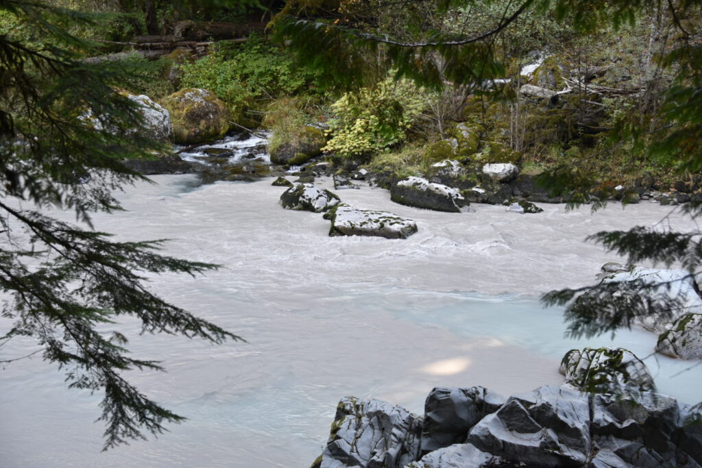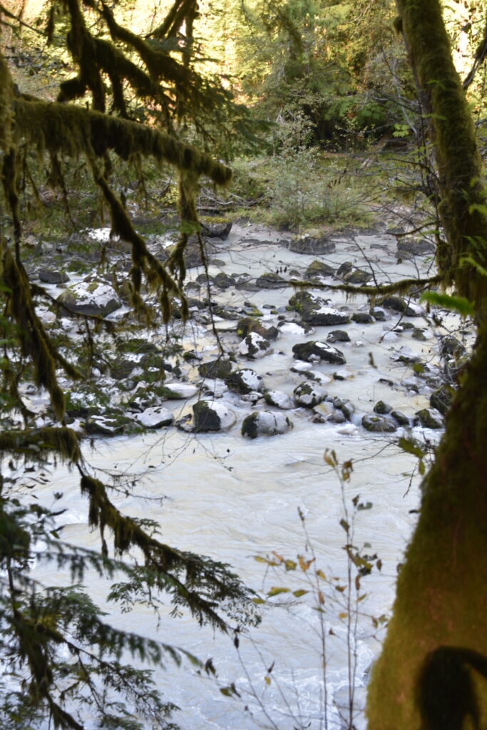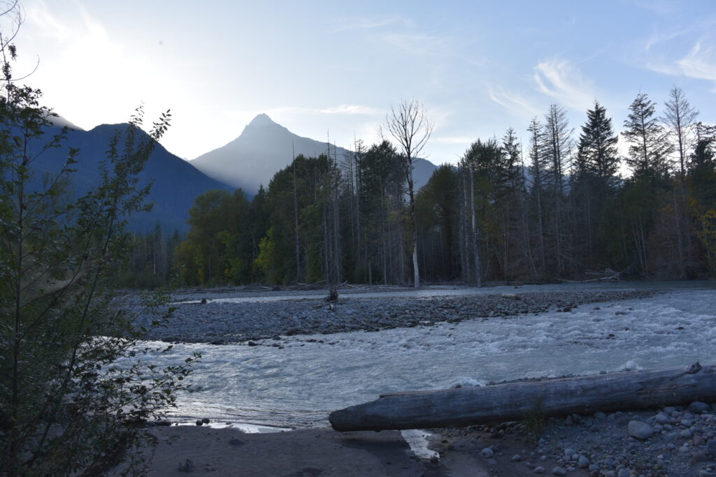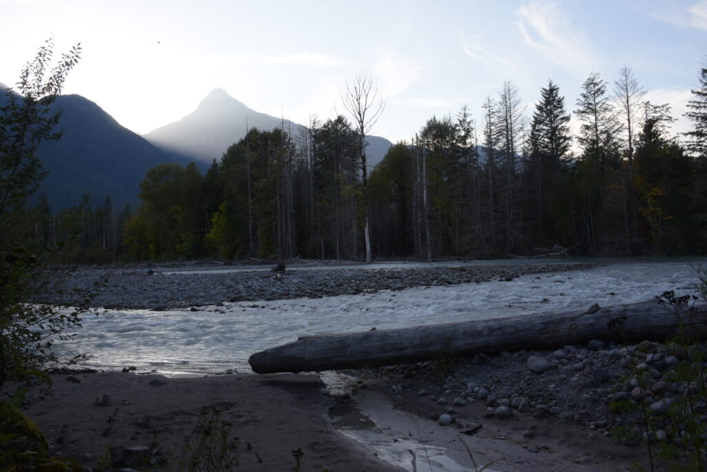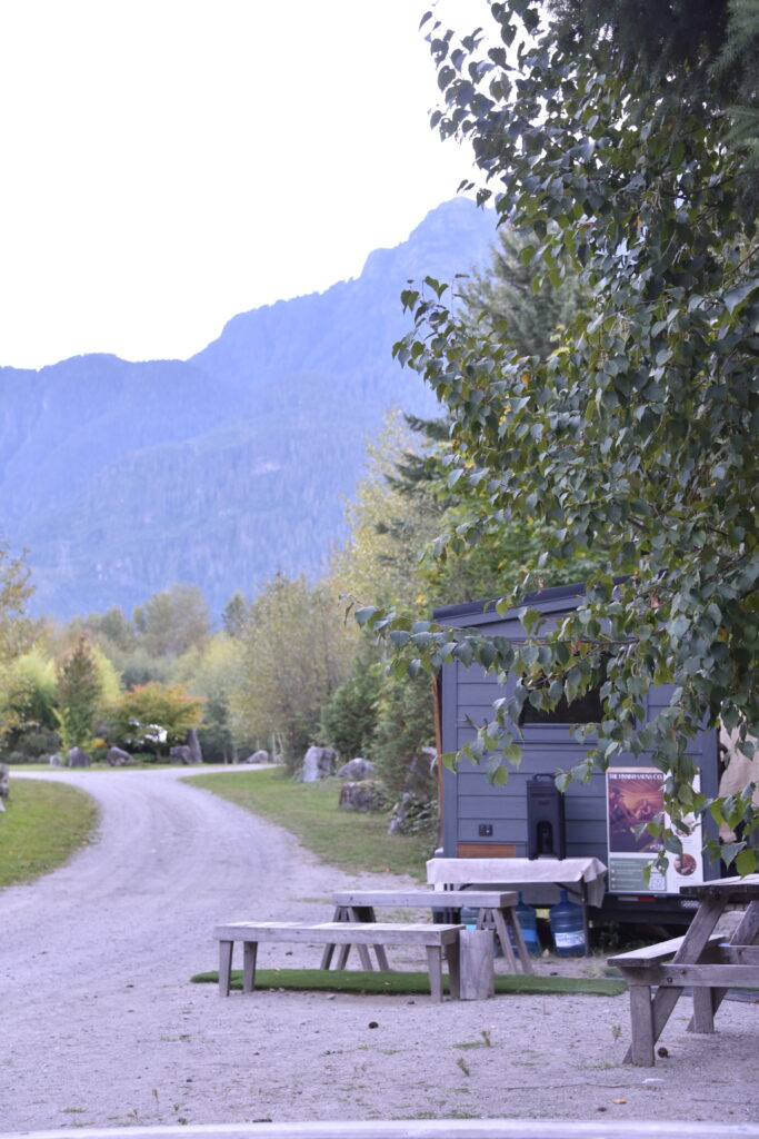 Après, Rika veut m’emmener à un sauna dans un ranch, Cheekye Ranch. On passe le portail, on croise une cavalière et on arrive au sauna, il n’y a personne. Il est 17h30. On a vu qu’en ligne il y a un créneau à 18h30. Rika appelle, la nana dit qu’elle arrive pour mettre tout en route pour 18h30 et qu’il reste des places pour ce créneau. Nickel. Le sauna, construit comme une tiny, est au bord de la rivière. On s’assoit au bord de la rivière. Rika dit « ça pue le poisson pourri ici », elle n’a pas tort. Pendant ce temps, la petite nana menue coupe du bois, allume le poêle, passe le balais dans la tente où se changer, puis sur les bancs, puis elle descend sur la petite plage sur la rivière, elle prends un gros bâton, et on la voit repousser des poissons morts dans le courant.. des énormes saumons. Je me fais des films sur la raison de la mort des poissons, puis on lui demande, et en fait la plupart des saumons meurent après la ponte des oeufs. Pauvrettes. Il y a un pygargue à tête blanche perché de l’autre côté de la rive, elle nous dit qu’ils viennent manger les poissons échoués parfois. Bon, on comprend l’odeur maintenant.