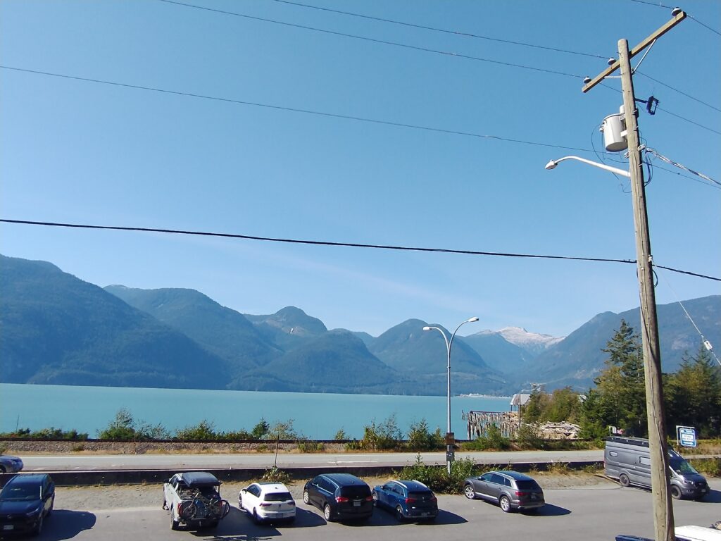 C’est parti pour un roadtrip sur la Sea To Sky highway. La pauvre Rika son taf n’arrête pas de l’appeler. Arrêt à Outbound Station pour manger un burger et une glace avec cette vue :